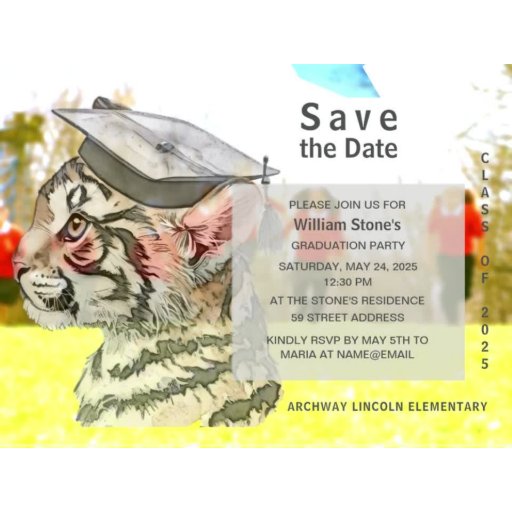Crie cartões de nome personalizados com três de suas fotos favoritas. Design de Formando Tiger na frente. Os detalhes do formando estão no verso e o espaço para três fotos. Use a modelo para personalizar. Cartão de Nome de Graduação com fotos.