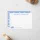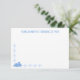 Este cartão apresenta uma silhueta azul desenhada à mão de um coelho com uma pequena borda de silhuetas de margaridas azul claro subindo parcialmente pela lateral e atravessando a parte inferior. Há um espaço no meio da parte superior para você escrever seu próprio nome e criar papelaria personalizada especial, ou manter a frase como está, que diz "ALGUÉM ESTÁ PENSANDO EM VOCÊ". No verso do cartão há um padrão repetitivo com silhuetas de coelho e margaridas.