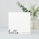 Um design mínimo de nota quadrada com um script manuscrito de na moda com uma grande frase de tipografia, que diz "olá", emparelhado com o seu próprio nome e um simples coração negro. Projetado no estilo moderno mininalista em preto e branco simples e limpo. O presente personalizado perfeito ou acessório para qualquer época do ano!