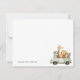 Este cartão de notas infantil apresenta um design limpo e minimalista no canto inferior direito de um velho caminhão verde-claro carregando um grupo alegre de animais, incluindo um urso, leão, girafa, raposa e um urso menor. O resto do cartão está em branco, criando uma estética simples e elegante.
