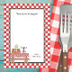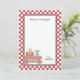 Um bebê adorável numa cesta de piquenique, completo com toalha de mesa, faça disso a nota de agradecimento perfeita para enviar para o seu Chá Baby Q. Itens correspondentes na nossa seção de CHURRASCO.