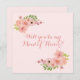 Elegante cartão cor-de-rosa com flores "você será minha dama de honra" apresenta buquês de rosas pastéis em aquarela, hibiscos e outras flores delicadas em tons de rosa e pêssego, com folhas botânicas verdes luxuriantes. Está colocado contra um fundo rosa pálido.