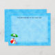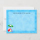Cartões de nota personalizados com letras retrógradas e praia divertida ou arte temática de piscina de natação de uma bola vermelha de praia, guarda-chuva verde, sandálias de férias e óleo de bronzeado em um fundo azul-d'água com ondas.