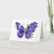 Borboleta de flores cinza, azul, safira, espumante com asa decorada com flores preciosos azuis com folhas de ouro sobre fundo branco.