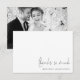 Escrito Elegante Casamento de Fotos Preto e Branco Obrigado. Com muito espaço em branco para que você possa escrever manualmente sua própria mensagem especial após o recebimento. Com um estilo elegante de escrita manual para Obrigados Tanta coisa e personalize facilmente os seus nomes e substitua a imagem de exemplo no verso por sua própria. DICA que esta foto tem um filtro preto e branco aplicado a ela, para desligá-la e ter sua foto colorido, clique no botão editar na ferramenta design, selecione filtros no painel direito e escolha nenhum.