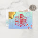 Frente: a placa tem um fundo azul claro. No centro, há um grande texto vermelho que lê "Parabéns para você", decorado com estrelas brancas e vermelhas. Acima do texto, há dois fogos de artifício brancos, e espalhados ao redor estão estrelas pequenas. À direita, há duas caixas-presentes com fitas vermelhas, e no canto inferior esquerdo, há um balão em forma de ouro. Back: Há uma caixa de presentes e ursos de pelúcia falsamente impressos, juntamente com as frases "desejamos o melhor" e "faça um desejo e comemore seu dia especial" em uma fonte elegante.