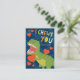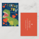 Cartão de Dia de os namorados bonito para crianças com ilustração de um t-rex verde segurando um coração vermelho em um fundo azul com as palavras "Eu te escolho". Design por Shelby Allison.