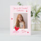 Cute Valentine's day greeting cards with photo, red heart lollipop and pink bow illustration. Bright lollipops pattern. Modern script lettering "You're the sweetest valentine". Pink and red colors. You can customize card with your text and photo.