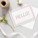 Design apresenta "Hello" na tipografia rosa-tendência. As letras negras são enquadradas em simples quadros duplos cor-de-rosa em um fundo branco. As costas são brancas e permitem muito espaço para a sua nota pessoal. Excelente por manter contato e dizer oi e olá à moda antiga!