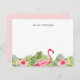 Cartão de anotação horizontal fixo personalizado apresenta um nome próprio personalizado em texto rosa moderno, acentuado com um flamingo rosa bonito e uma borda de folhas verdes de palma e flores de hibisco cor-de-rosa. Uma design de papelaria colorida e giratória para o verão.
