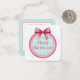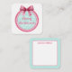 This cute note card features a Christmas ornament in soft shades of pink and aqua with a matching pink bow on top. The back features matching aqua and tiny white polka dots. Personalize the front with your choice of special text and back with your choice of name. Fun for gift tags and party favors.