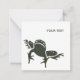 Cartão de nota personalizado da silhueta sapo. Sapo na parte inferior frontal esquerda, campo de texto na parte superior direita alinhado. Voltar ao texto no centro. Branco com texto verde escuro.