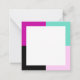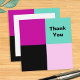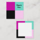 Diga um na moda 'Obrigado' com esta placa moderna de bloqueio de abstrato. A frente do cartão é dividida em quatro seções quadradas, de cor magenta, preta, turquesa e rosa. No verso, o cartão é branco para você escrever sua própria mensagem, com uma borda dividida nas quatro cores acima. O estilo simples e contemporâneo é certamente uma impressão de destaque.