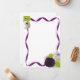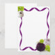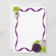 Papel de carta que tem rosas roxos, rosas brancos e roxos e flores verdes em uma borda de fita.