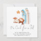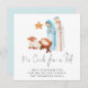 Sem Críticas Para O Cartão De Natal Da Natividade Da Cama. Uma bela cena simples de Natividade pintada, com Maria, José e Jesus bebê em um mangueiro, e a letra Sem Cribo para uma Cama em um roteiro de na moda, em um fundo branco para um sentimento contemporâneo. Personalize facilmente a sua saudação e os seus nomes no fundo. O plano de fundo azul de coordenação do outro lado pode ser alterado para outra cor, se preferido, através da opção personalizar mais.