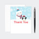 A maravilha de inverno "ONEderland", primeira festa de aniversário, obrigado nota que a placa inclui espaço na parte inferior e posterior para uma mensagem de obrigado escrita à mão. Design apresenta um feliz boneco de neve vestindo um chapéu e cachecol e um pinguim ártico bonito com o chapéu de Papai Noel e o número "1" na barriga que está acenando na neve. O fundo tem um padrão de flocos de neve. Cor azul-gelo, turquesa, vermelha e branca com sotaques pretos e cinzas.