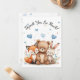 Complete your woodland-themed celebration with this adorable thank you card featuring a sweet bear, fox, and bunny surrounded by soft pastel watercolor florals and floating blue hearts.