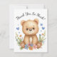 Complete your woodland-themed celebration with this adorable thank you card featuring a sweet bear cub surrounded by soft pastel watercolor florals and floating blue hearts.