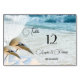 Cartão de número da mesa de casamento com dois gannets na praia. Bonita celebração de casamento costeiro para amantes de os animais.