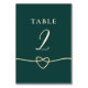 Adicione um toque de elegância às mesas da sua recepção com este cartão de número de mesa de casamento em verde esmeralda e dourado. O detalhe romântico do coração de corda e a fonte serifada clássica complementam estilos de casamento modernos e atemporais. Combina perfeitamente com o conjunto Emerald Wedding Suite para uma aparência coesa.