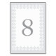 As modernas placas de números de tabela inspiradas em Marrocos apresentam uma fronteira geométrica em cinzas de prata pálidas etéreas e brancas, ao redor do número de sua mesa em cinzas médias. Design repete-se no lado oposto. Coordena-se com a nossa suíte de convite para casamento árabe em Silver Pearl.