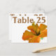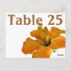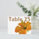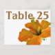 Os cartões de número de mesa de flores tropicais apresentam um hibisco de cor coral e uma fonte de tom de bronze. Personalize ambos os lados. O texto também pode ser personalizado ou excluído.