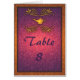 Uma placa de número de mesa de casamento divertida e colorida com uma lâmpada árabe mágica e detalhes do ornamentado. O cartão é um gradiente roxo e cor-de-rosa com salpicos de ouro. O cartão é emoldurado em fazer dourado, é divertido, mas sofisticado.