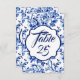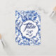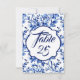 Um cartão de número da mesa de casamento com um design floral azul e branco.