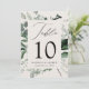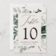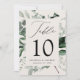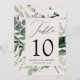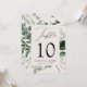 Cartões de mesa de casamento elegantes e botânicos com o número da tabela, seus nomes e data de casamento aninhados em um quadro retangular cercados por eucalipto, samambaias e outros ricos verdes com fundo creme. Personalize o número de cada placa de mesa e adicione-o ao seu carrinho. Os cartões de mesa 5x7 foram projetados para coordenar com nossa coleção de casamento Abundant Greenery.