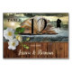 Uma elegante placa de número de mesa com um livro em uma paisagem sonhadora com um casal apaixonadamente abraçando e rosas sobre um fundo de madeira escura. Bonita para um casamento de biblioteca ou uma celebração com amantes de livros.