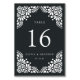 As cartas de números de tabela chic da Art deco apresentam um fundo preto e tinta adornada com o estilo papel picado branco de líado, detalhando nos cantos. Personalize com seus nomes e data de casamento, ou nomeie cada mesa para um toque pessoal extra. Design repete-se no lado oposto. Coordena-se com a nossa suíte de convites de casamento de Beaux Arts em Charcarbont.