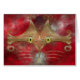 Uma face estilizada de gato feita de curvas e curvas douradas brilhantes, com olhos largos de ouro verde, contra um fundo fractal vermelho.