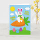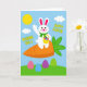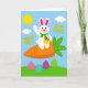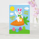 Este cartão mostra um coelho branco estilizado com detalhes cor-de-rosa nas orelhas e bochechas, fazendo um aceno suave que parece um simpático cumprimento 🐰. Com o outro braço, o coelho segura uma pequena cesta amarela repleta de guloseimas coloridas em forma de ovo, adicionando um toque doce de partilha entre amigos. O coelho senta-se num grande cenoura laranja com folhas verdes no topo, como se tivesse reivindicado um poleiro aconchegante num jardim de primavera. Atrás dele, há um céu azul claro com um sol amarelo redondo e algumas nuvens brancas e macias que pairam 🌷. No céu superior, o cumprimento “BOA PÁSCOA” aparece em letras amarelas brilhantes, centralizado e fácil de ver. Ao longo da parte inferior, colinas verdes onduladas estendem-se pela cena, mantendo tudo fundamentado e calmo. Espalhados pela grama estão ovos superdimensionados em rosa, azul, roxo e verde-limão