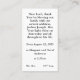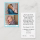 O design frontal oferece um lugar para até duas fotos. A imagem de cima da Virgem Bênçada Maria pode ser deixada como está ou substituída. O nome da criança é exibido em azul na parte inferior. Todo o design está enquadrado em azul. Uma faixa branca aparece em azul no nome da criança portadora da frente. O reverso apresenta uma oração personalizável para o seu bebê com data de nascimento e estatísticas apresentadas abaixo. Excelente de entregar a amigos e familiares para anunciar o nascimento do bebê. Também disponível em rosa.