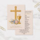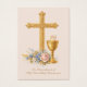 Personalize este lindo cartão de lembrança da Primeira Comunhão com desenho floral de cruz, hóstia e cálice dourado com uma bela oração católica tradicional Anima Christi no verso.