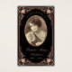Um cartão de oração memorial com ar vintage para um funeral. Em ambos os lados, é preto e tem uma elegante imagem de ouro barroco vintage (faux) rosa. Na frente, há uma foto oval vintage com borda dourada rosa e texto rosa acima e abaixo dela. As palavras "na memória amorosa" são arquivadas acima da foto. O nome é escrito sob ele em um roteiro caligráfico elegante. No verso há uma oração, em bonés cor-de-rosa, com uma cruz de ouro rosa. O pano de fundo com as suas elegantes decorações barrocas de ouro sobre a ligação de couro azul é de uma coleção de cobrir franceses, de Georges Mercier (1885-1939) - Madame de Maupin, por Teophile Gautier, volume 1, edição 1911, Paris - agora no dominio público, da Biblioteca Pública de Nova Iorque. A foto marcante, um retrato de sépia antigo de uma jovem no início dos anos 1900, foi oferecida por Zoltan Matuska, de Pixabay, livre para uso comercial.