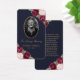 Cartão de memória floral azul/cartão de oração funerária com uma foto adornada com rosas vermelhas rosa-pincelado e burgundy e flores de hálito de bebê em um fundo azul escuro.
