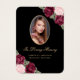 Belo cartão de memória floral preto e dourado/cartão de oração funerária com uma foto adornada com rosas de cor-de-água rosa e vermelho borrado e o hálito do bebê sobre fundo preto.