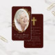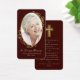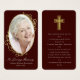 Um tributo elegante e ponderado a um ente querido. Um quadro oval de ouro feminino e ornamentado enquadra a fotografia do falecido. Três linhas de texto abaixo permitem personalizá-lo. Eu escolhi em Loving Memory, seu nome e datas de vida. Uma cruz de ouro espumante rico está no topo da parte de trás. Abaixo há espaço para uma oração, salmo ou poema. O fundo é vermelho escuro e cheio de lenha.