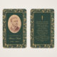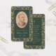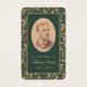 Um cartão de oração memorial com um ar retrô para um funeral. Em ambos os lados, tem uma moldura dourada elegante e antiga com espirais de folhas douradas num fundo verde escuro. Na frente, há uma foto oval antiga com uma borda dourada e texto dourado abaixo dela. O nome está escrito em uma caligrafia elegante. No verso, há uma oração, em letras maiúsculas douradas, com uma cruz dourada acima dela.