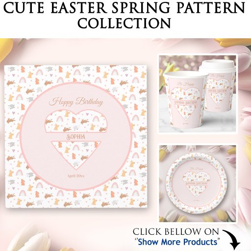 Páscoa, primavera, cartão de aniversário com coelho bonito e divertido, cordeiro e padrão arco-íris. Personalize facilmente o texto ou deixe algum vazio de texto. Kate Eden Art