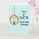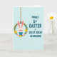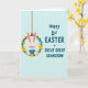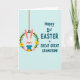 Este cartão apresenta um coelho rosa claro vestido com um traje azul suave, sentado confortavelmente dentro de uma grinalda floral verde com um olhar gentil e afetuoso que parece um abraço familiar 🐰. As orelhas longas do coelho inclinam-se ligeiramente para cima, com um nariz vermelho minúsculo e bochechas rosadas que adicionam um charme terno e amigável. A grinalda é feita de um aro de videira marrom e decorada com pequenas flores amarelas e azuis pálidas, escondidas entre raminhos verdes frondosos como uma lembrança da primavera 🌷. Um cordão marrom fino na parte superior faz com que a grinalda pareça suspensa, como se estivesse balançando levemente no ar. No lado direito, letras azul-esverdeadas em maiúsculas grandes e fáceis de ler dizem “Feliz 1º PÁSCOA BISNETO!” empilhadas em várias linhas. O texto está sobre um fundo azul pálido com uma textura de linha diagonal tênue, dando ao layout uma sensação calma e arejada ao lado dos detalhes mais