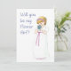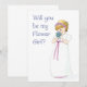 Um cartão de convite com uma menininha vestida de daminha timidamente cheirando o ramalhete de flores, de uma pintura aquarela de Judy Adamson. O convite na frente é 'Você quer ser minha Menina de Flores?' e o verso fica em branco para a sua própria mensagem.
