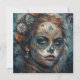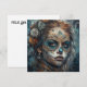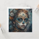 Celebre o "Dia dos Mortos" com este cartão de arte fina impressionante, apresentando uma mulher com pintura facial calavera intricada em turquesa e dourado. A obra de arte é uma aula magistral em detalhes, misturando motivos tradicionais de caveira de açúcar mexicanos com texturas etéreas e esfumaçadas e adornos de rosa elegante em seus cabelos. Com seus tons azuis profundos e sombrios e expressão penetrante, este design é uma maneira poderosa e bonita de homenagear os ancestrais ou enviar uma saudação impressionante para uma celebração do Dia de los Muertos.