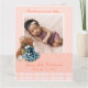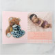 Um doce cartão de anúncio de bebê de cor laranja de pêssego com um padrão de cheque e desenho de um pato de brinquedo e ursinho de pelúcia. Personalize com seus detalhes e uma foto especial do seu filho. Uma forma excelente de anunciar sua nova chegada à família e aos amigos. O cartão é especialmente concebido para dar ao receptor duas fotografias de recordação para serem apresentadas, dobrando o cartão de volta ou duas fotografias maravilhosas para guardar. Projetada exclusivamente por Sarah Trett.