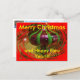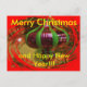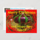 Uma Bola de Natal Vermelha e Verde fechou numa Árvore de Natal, Com um quadro vermelho brilhante e colorido que está em um CARTÃO POSTO CHRISTMAS!!!!