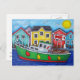 Cena colorida de um barco de pesca trazendo muita lagosta para uma adorável cidade nas Maritimes pela artista popular Lisa Lorenz agora em um cartão de posto.