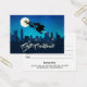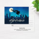 Ilustração de papais noeis Sleigh: Uma carona na noite sobre o horizonte de uma cidade com o céu noturno e a lua brilhante e estrelas ao fundo.