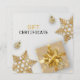 Design de férias de alta qualidade elegante com flocos de neve glamourosos de ouro brilhante, bolas de árvores de Natal douradas e uma caixa de presentes de ouro sobre fundo de cinza leve. Este cartão de presente festivo sazonal é perfeito para a sua pequena empresa ou para oferecer amigos e família.