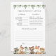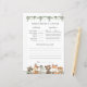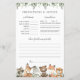 Cartão de previsões e conselhos de baby shower temático de animais da floresta apresenta uma ilustração de animais da floresta em aquarela e guirlanda de eucalipto com vegetação em aquarela e fonte elegante em estilo manuscrito.